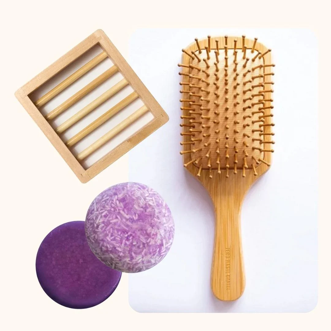 Save over $25 with the Purple Rain Essential Bundle. Includes: 1x Purple Rain shampoo bar 1x Purple Rain conditioner bar 1x Bamboo Tray - to make your bars last 5x longer! 1x Bamboo Hair Brush - reduce static frizz. Packed full of hydrating and nourishing natural ingredients, Purple Rain is designed to combat frustrating frizz and soothe dehydrated and itchy scalps. Acai oil hydrates and conditions dry hair. Aloe adds moisture and shine to every strand. Vitamin B promotes hair growth and strength. Vitamin E soothes scalp irritation and itchiness. Cocoa butter adds volume and protection. Acai's natural purple color helps to correct brassy undertones, making Purple Rain perfect for blonde and gray hair. These bars should last between 75-90 washes. (Although we've had some customers tell us they have lasted over a year!)