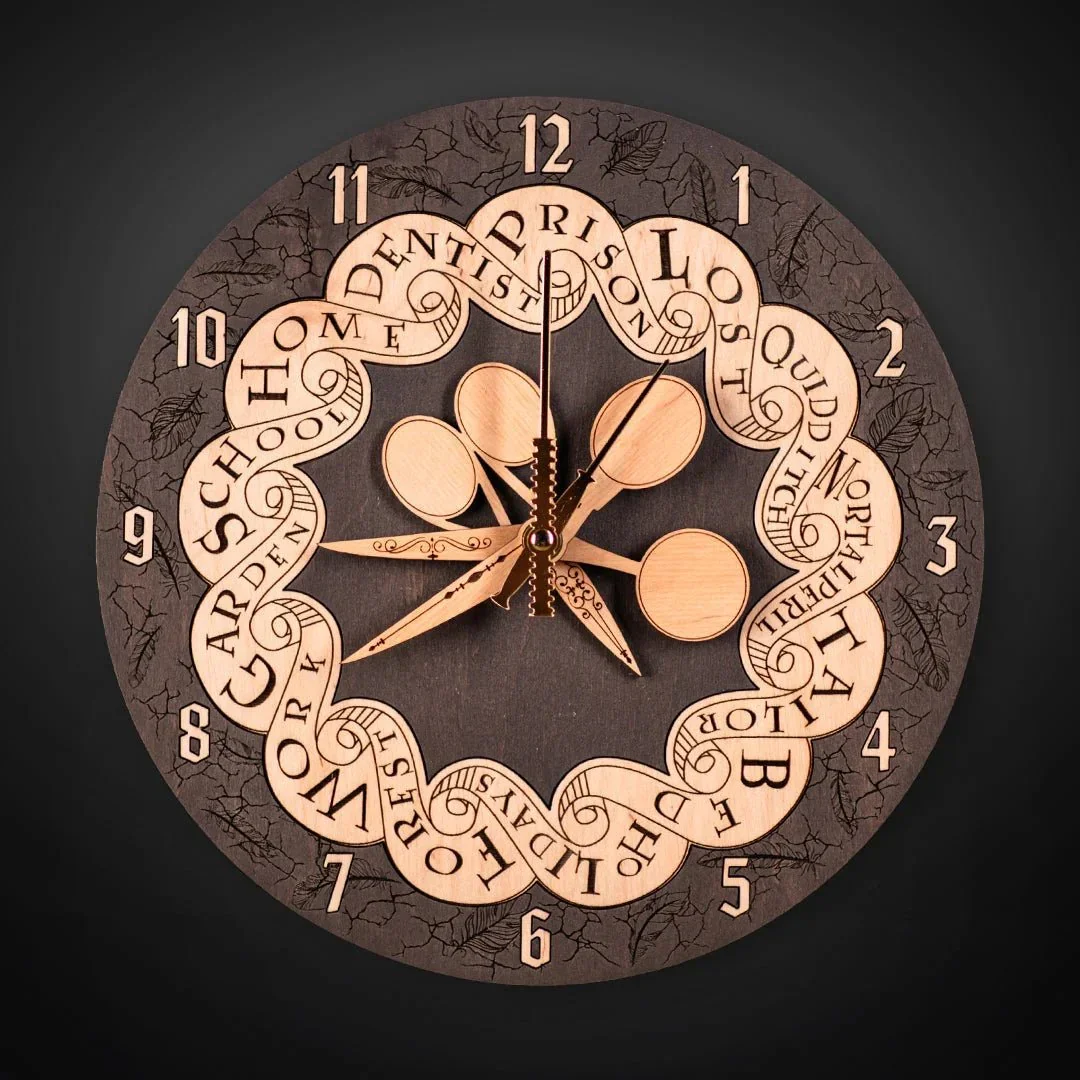 Immerse yourself in the artistry of our officially licensed Weasley Family ™ Clock . It's not just a clock, it's a portal to the magical universe, where every moment resonates with wizarding charm. • Officially licensed • Unique design • Perfect gift-idea • Free International express shipping • The frame and plexiglass are included and ready to hang • Silent clock mechanism CLOCK SPOONS INSTRUCTIONS • Included Set: Your clock comes with a set of spoons. • Photo Cutting: Easily cut your photos with the provided wooden stencil. • Glue Usage: Use any white glue to adhere your photos. • Positioning: To move the spoons, simply place them in the desired position. For the mechanism to work correctly, spoons are connected in 2, 3, or 4 pieces. The spoons can be moved in connected groups. Frame Information: The clock includes a frame and hanging tools for convenient setup. To reposition the spoons, open the frame and adjust them as needed. CLOCK FEATURES • For all Harry Potter fans • This clock is made of natural wood by hand and laser cutting • The clock is very detailed , there you can find the places of all the adventures of our favorite characters • You can personalize the back of the clock with an inscription simply by entering the desired phrase in the order note. Personalization costs start from $25. • You will receive a frame and plexiglass along with the clock. So you can easily hang it in your home, and it will please you and your family for many years. SIZES M - 19x39cm, 7.5"x 15.8" L - 26x55cm, 10.5"x 22" XL - 38x78cm, 15"x 31" QUESTIONS ❓ Please write to us with any questions and get an answer within 24 hours.